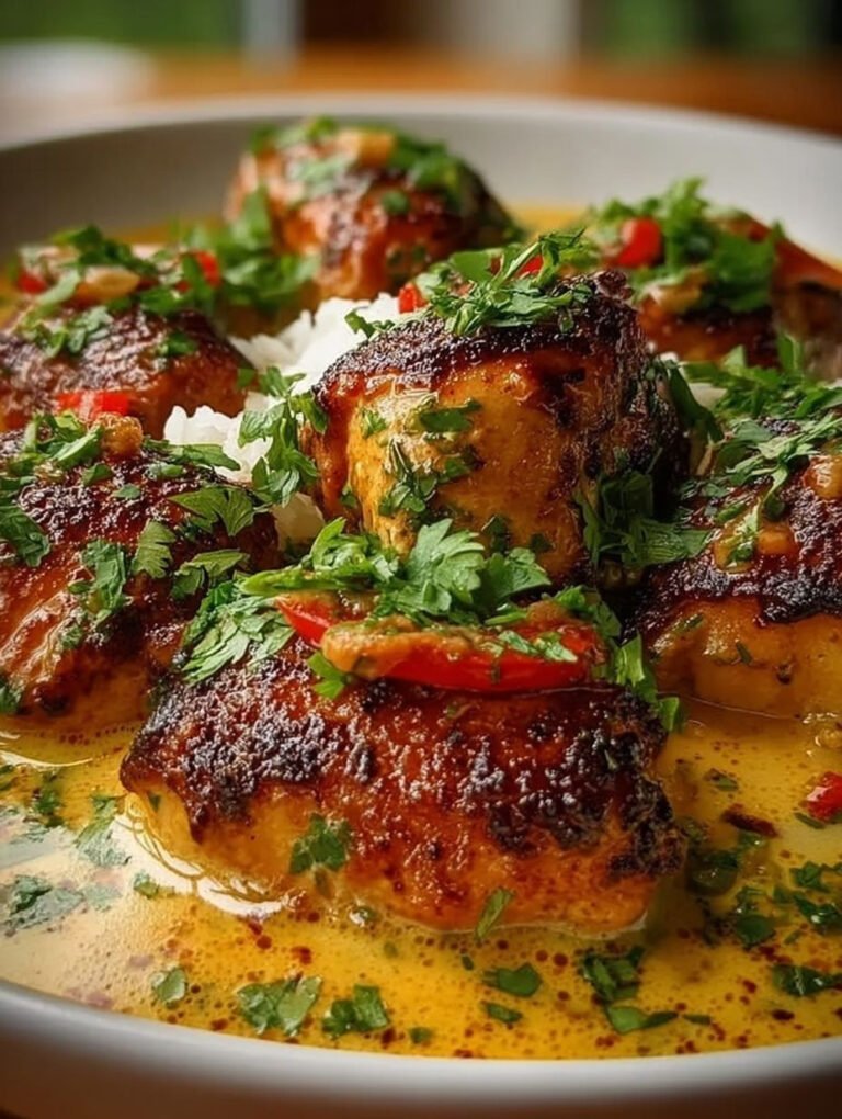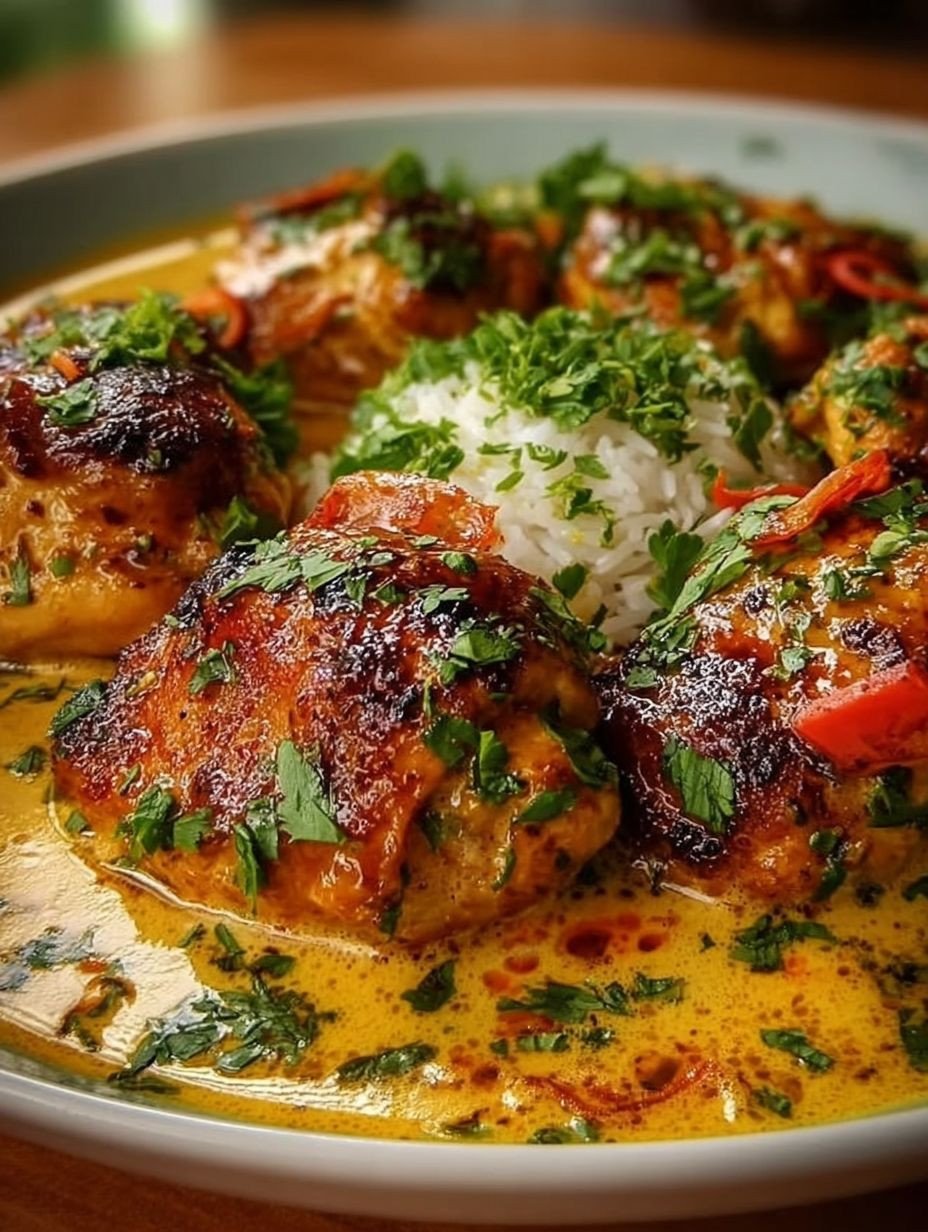 • Serviere das Kokosnuss-Hühnchen mit duftendem Reis oder frischem Brot, um die cremige Sauce perfekt aufzutunken.