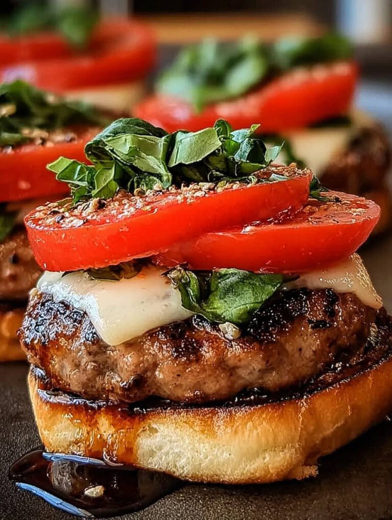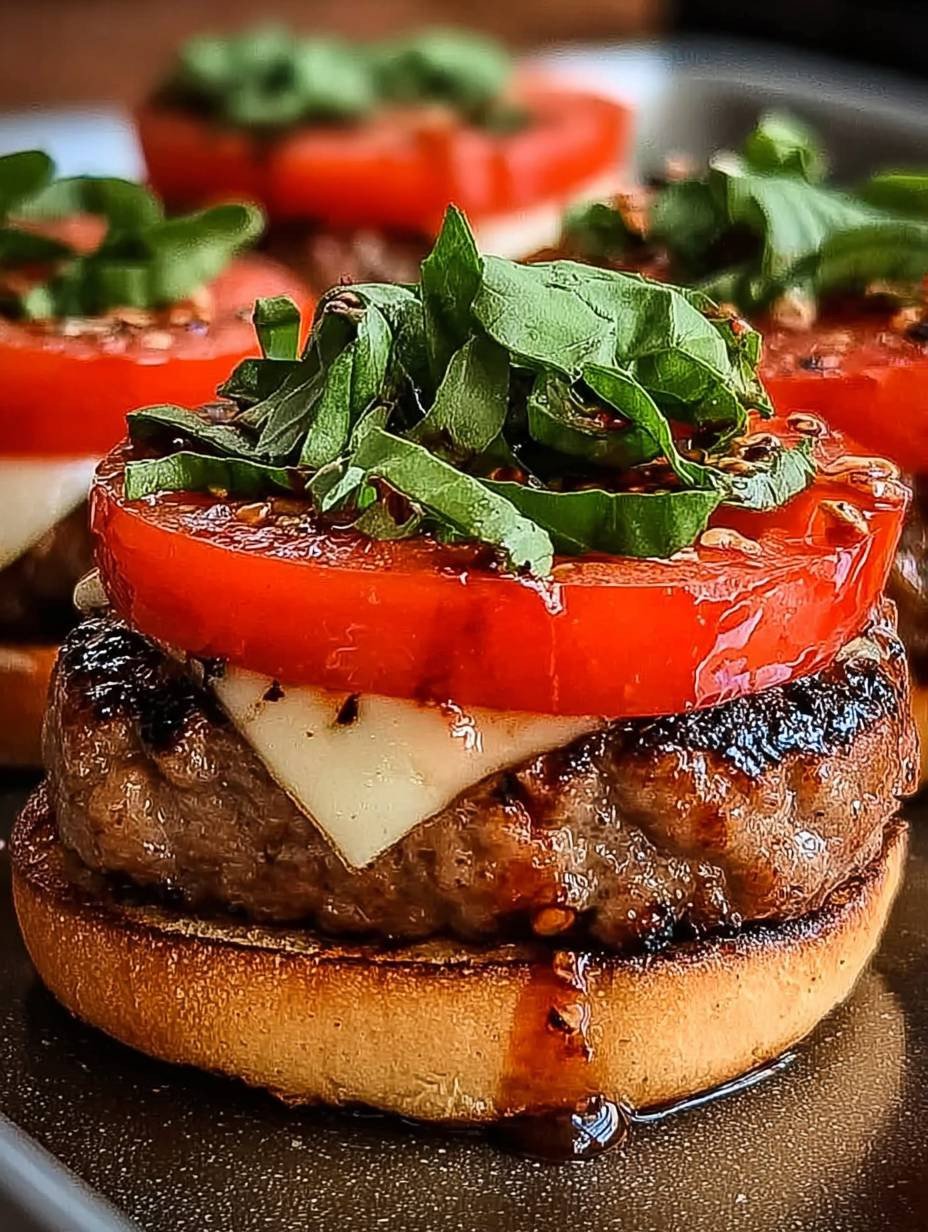Erleben Sie den Bruschetta-Burger, der saftiges Rinderhackfleisch mit geschmolzenem Mozzarella und frischen Tomaten kombiniert.