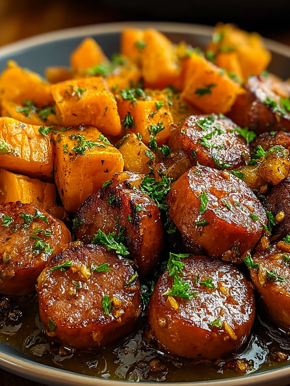 Hähnchenwurst mit Honig-Knoblauch-Geschmack, Süßkartoffeln
