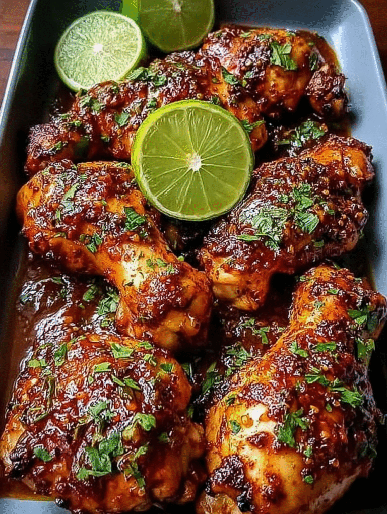 Lassen Sie das Hähnchen nach dem Backen fünf Minuten ruhen, bevor Sie es anschneiden; diese Ruhezeit ist entscheidend, damit sich die Säfte im Fleisch verteilen können. Das Gericht kann auf Tellern angerichtet werden. Bestreuen Sie es vor dem Servieren optional mit frischen Korianderblättern und einem weiteren Spritzer Limettensaft für einen zusätzlichen Frischekick. Die Kombination aus zartem Fleisch und der feurigen Glasur ist unwiderstehlich.