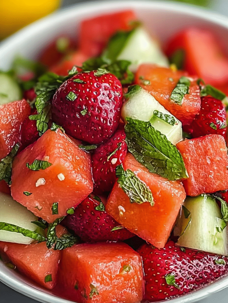 • Dieser Salat kombiniert die natürliche Süße von Erdbeeren und Wassermelone mit einem Hauch von Minze für ein unvergesslich leichtes Geschmackserlebnis.