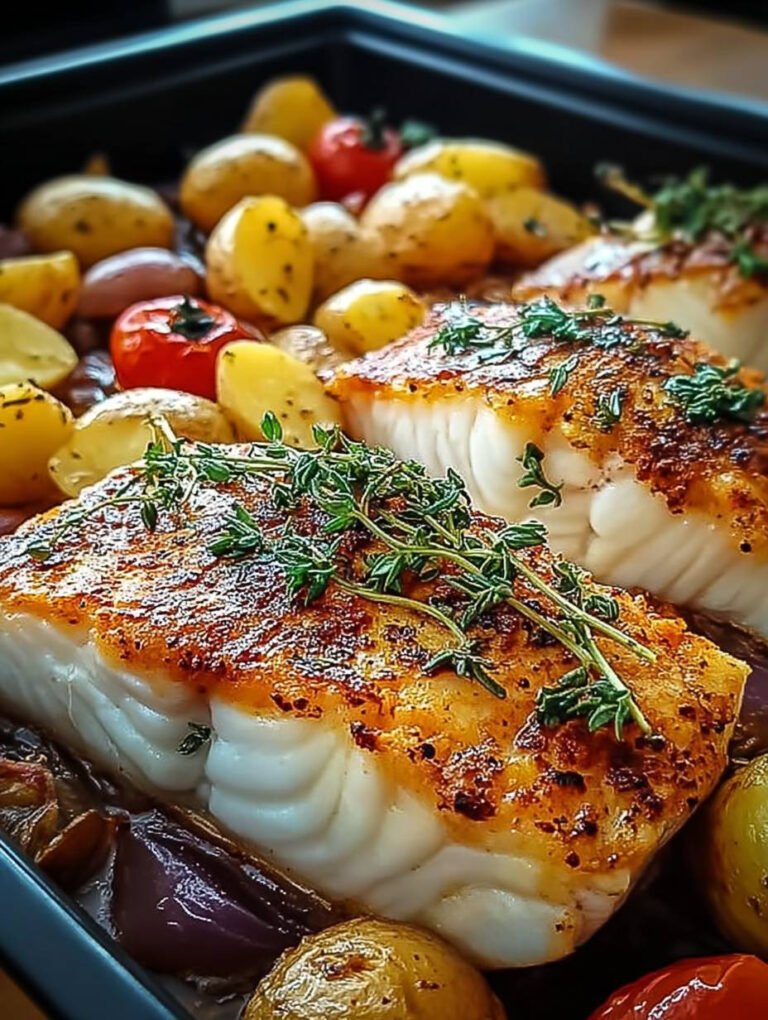 5. Step 5: Das Backblech wieder in den Ofen geben und alles für weitere 20-25 Minuten backen, bis der Fisch gar ist und die Kartoffeln goldbraun sind.