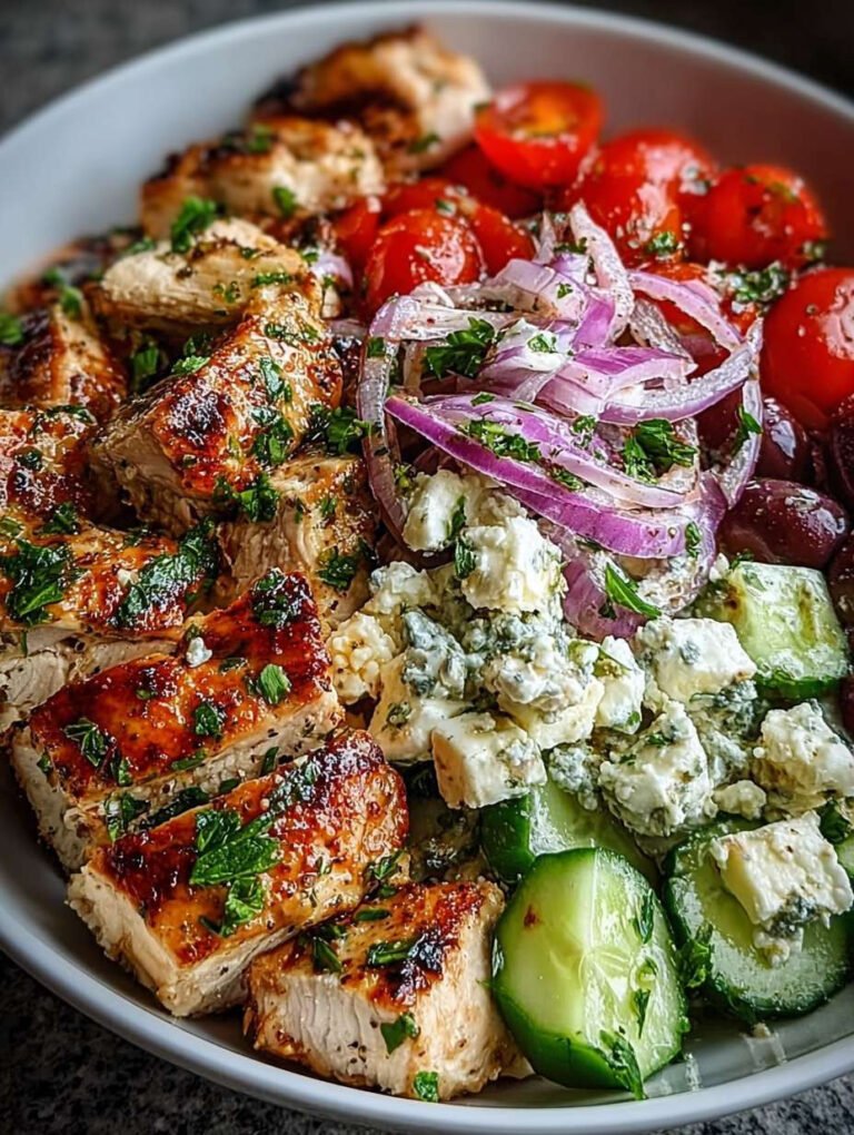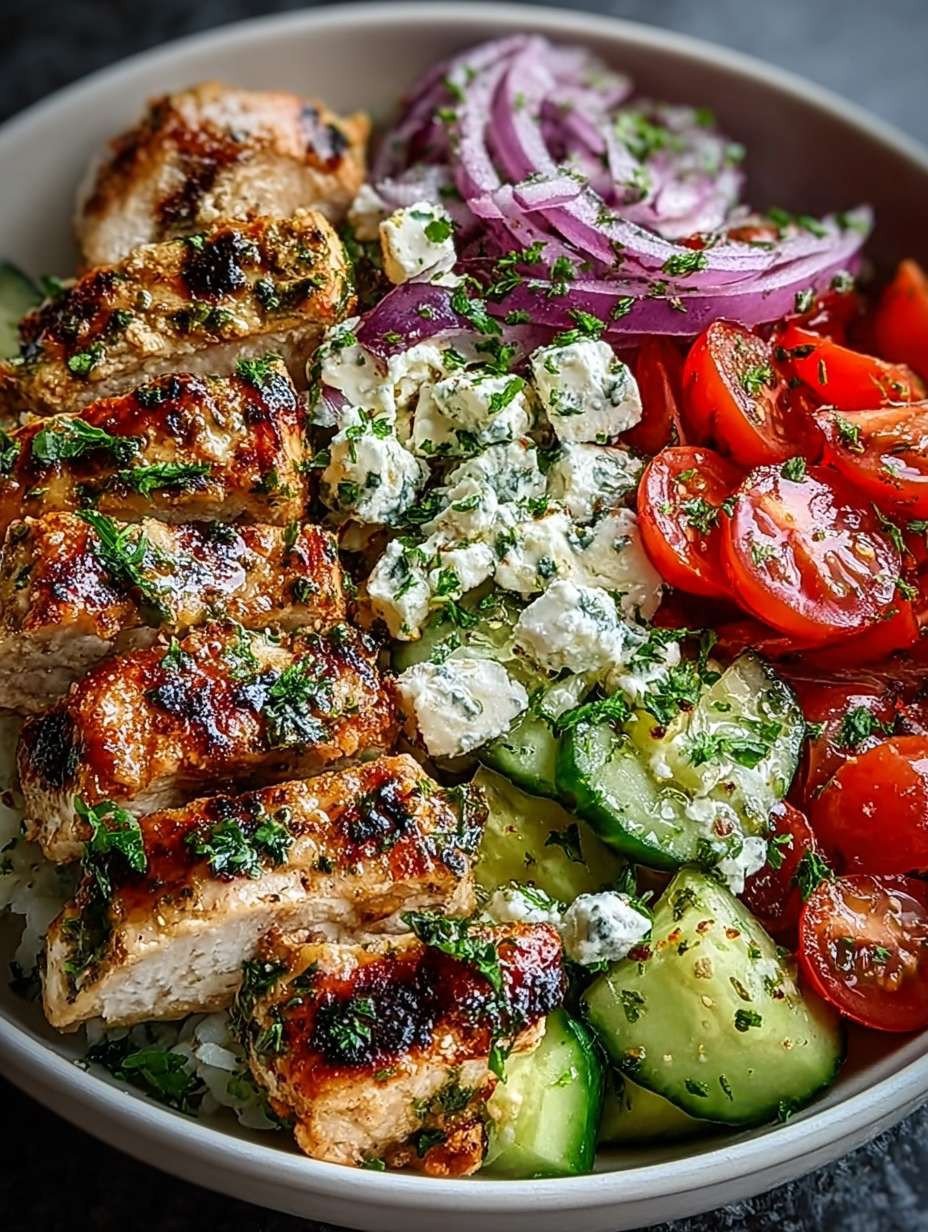 Genießen Sie die Aromen der Mittelmeer-Küche mit dieser Griechischen Hähnchen-Bowl. Zartes Hähnchen, frische Gurken und würziger Feta vereinen sich harmonisch.