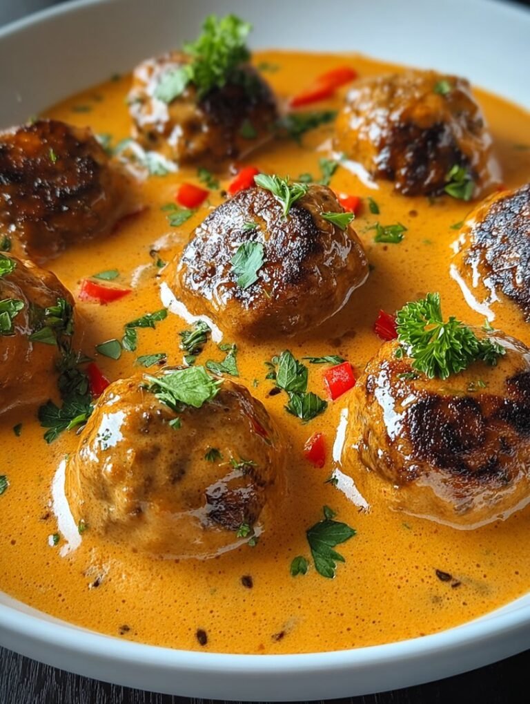 Geben Sie die angebratenen Fleischbällchen zurück in die Soße. Achten Sie darauf, dass sie gut bedeckt sind. Lassen Sie dieHackbällchen in cremiger Paprikasoßezugedeckt bei niedriger Hitze für weitere 10 bis 15 Minuten sanft köcheln, bis die Bällchen vollständig durchgegart und unglaublich zart sind. Die Soße wird in dieser Zeit die Aromen der Fleischbällchen aufnehmen und sich perfekt abrunden. Servieren Sie dieses Gericht großzügig, am besten mit frischer Petersilie bestreut, und beobachten Sie, wie die Teller im Rekordtempo leer werden.