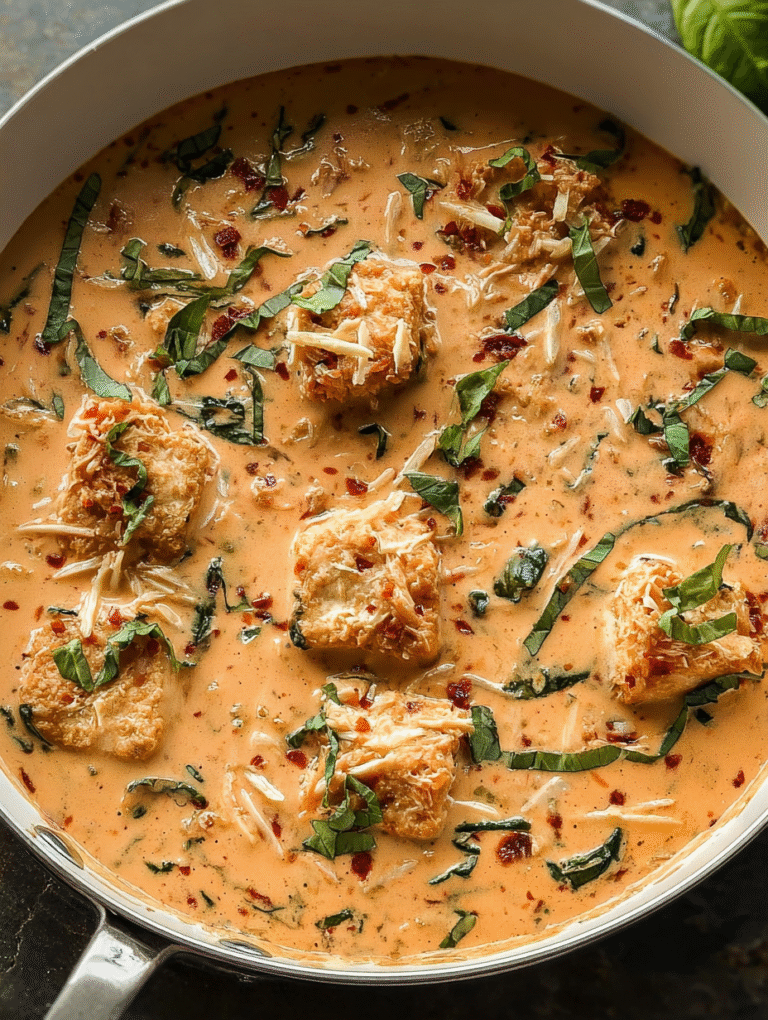 Die Tofu-Hochzeit des Jahres: Außen knusprig, innen zart, gebettet in eine herzhafte Sauce aus Tomatenöl, Knoblauch und cremiger Pflanzensahne.