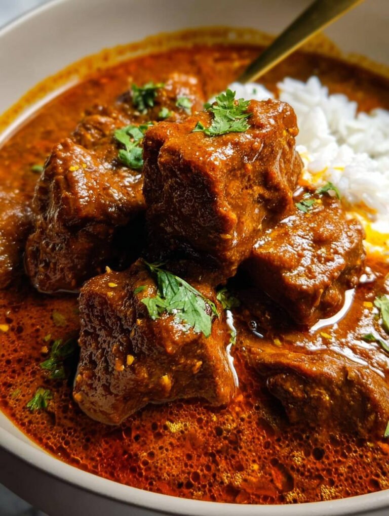 Entdecken Sie das Indische Rezept für Rindfleischjus de raisindaloo, wo zartes Rindfleisch in aromatischen Gewürzen und Zwiebeln geschmort wird.
