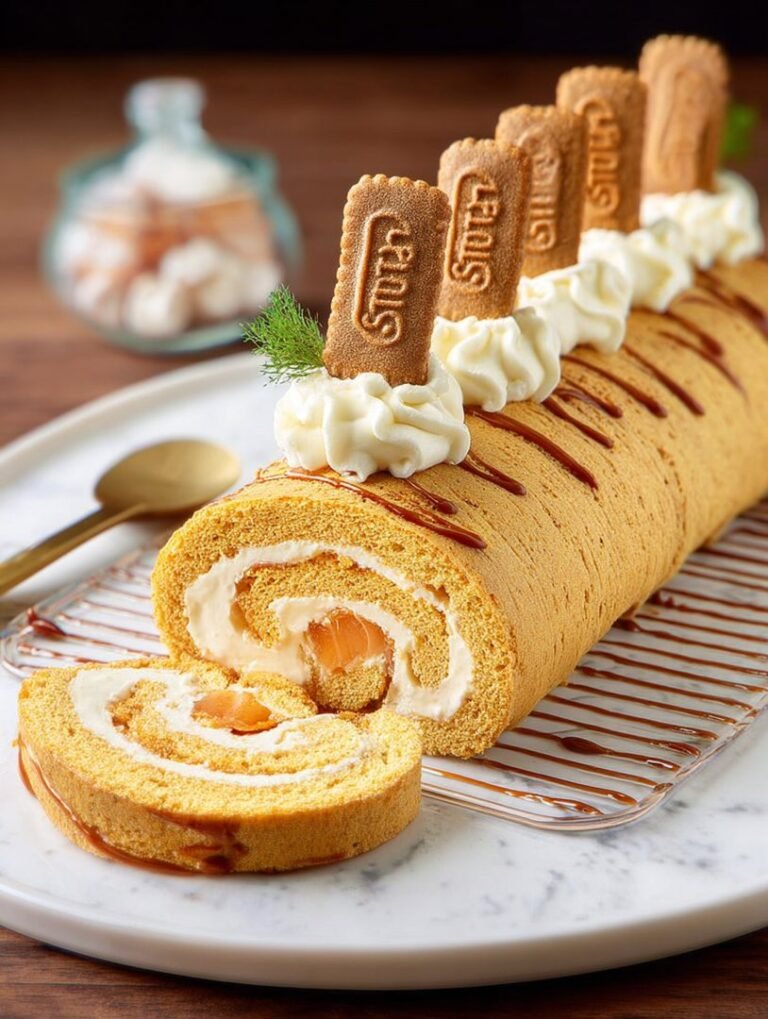 Erleben Sie die Biscoff-Explosion! Diese No-Bake-Roulade kombiniert kaffeegetränkte Kekse mit einer cremigen Frischkäse-Füllung und extra Biscoff Aufstrich.