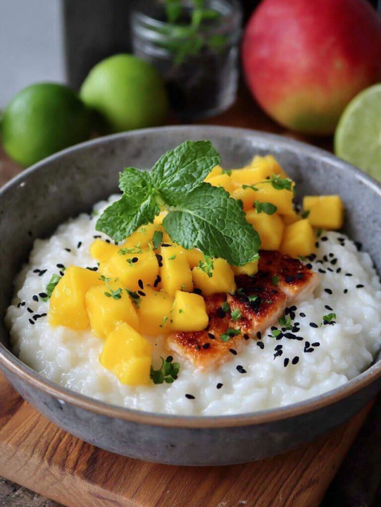 - Serviere das Mango Sticky Rice am besten leicht warm und garniere es mit frischen Mangoscheiben sowie einer Prise geröstetem Sesam oder Mungobohnen für einen zusätzlichen Crunch.