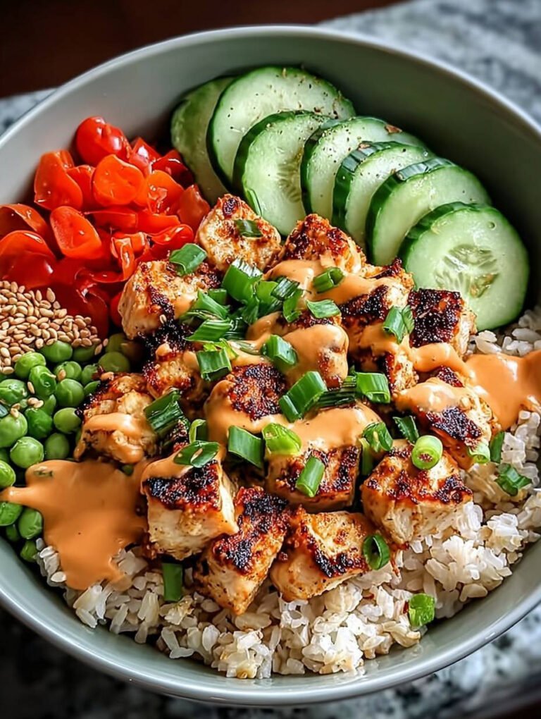 Diese Bowl ist nicht nur ein optisches Highlight, sondern auch ein voller Genuss für alle Sinne. Mit frischen Zutaten wie knackigem Gemüse und saftigem Hähnchen wird jedes Gericht zu einem kulinarischen Erlebnis. Die Erdnusssauce rundet alles ab und bringt eine angenehme Süße ins Spiel, die perfekt mit den herzhaften Komponenten harmoniert.