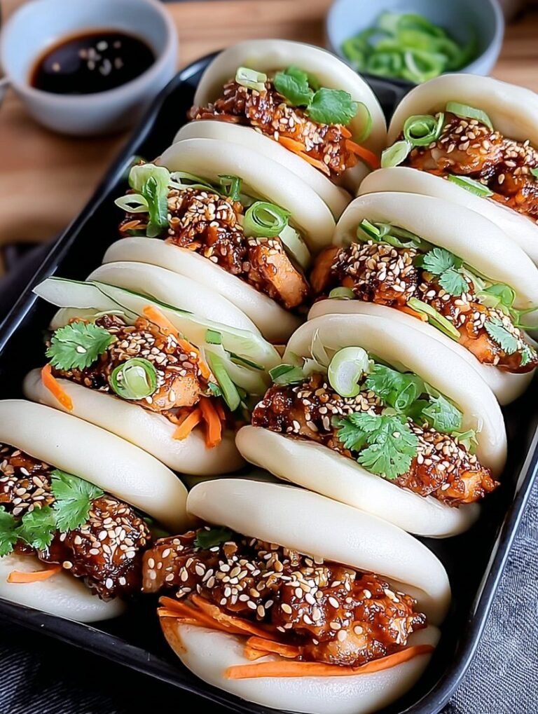 Da wir in der Küche keine Kompromisse eingehen, füllen wir unsere Buns mit langsam geschmortem Rindfleisch. Dieses Rindfleisch wird in einer tiefen Sauce aus Sojasauce, Reisessig, braunem Zucker und frischem Ingwer mariniert und dann stundenlang sanft geschmort, bis es förmlich zerfällt. Es ist die perfekte Kombination aus herzhaft und leicht süßlich. Während das Rindfleisch im Mittelpunkt steht, bringt das Topping die notwendige Frische. Ein Klecks scharfe Mayo, knackiger Koriander und fein geschnittene Karotten oder Gurken sorgen für Textur und einen kühlen Kontrast zur warmen, dichten Füllung. Es ist dieses Spiel der Kontraste – weich gegen knackig, warm gegen kühl, süß gegen salzig – das dieseUnwiderstehliche Bao Bunswirklich unvergesslich macht.